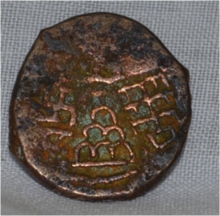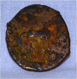 Coin in irregular shape. Obverse Deer at the centre and facing left and brahmi legend at the bottom. Reverse Triangle headed with a base in right and swastika above it, arched hill at the centre and tree in railing on the left.
