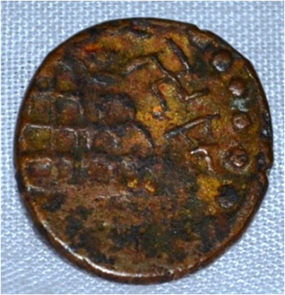 Obverse Deer on the left facing female figure with up raised right hand and left on the hip and brahmi legend in half around. Reverse In right tree in railing, six arched hill at the centre, triangle headed with a base on the left and swastika above it.