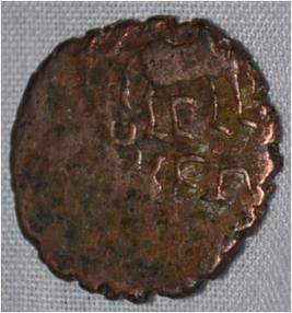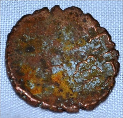Obverse Deer on the top left and brahmi below it. Reverse Six arched hill at the centre, triangle headed with a base on the left and swastika above it.