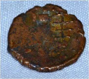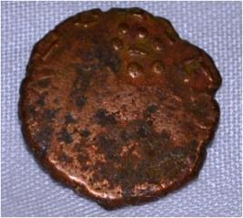 Coin in irregular shape. Obverse Six headed male Kartikeya standing and facing and traces of the legend on the top. Reverse Tree in railing showing three horizontal branches, each with short vertical leaves pointing down wards in right, six arched hill on the left.