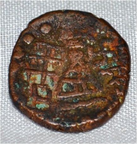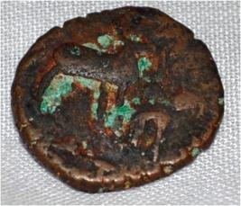 Coin in irregular shape. Obverse Deer on the left and facing female figure, traces of the legend on the left and bottom. Reverse Tree in railing showing three horizontal branches in right , six arched hill with umbrella at the centre, triangle headed with a base on the left and swastika above it.