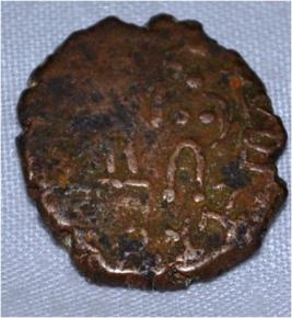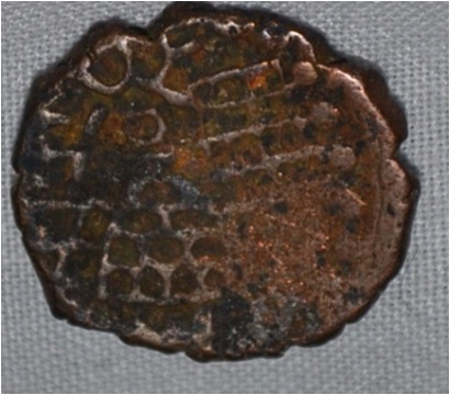 Coin in irregular shape. Obverse Deer on the left facing female figure with up raised right hand and left on the hip. Brahmi legend on the left and bottom. Reverse Triangle headed with a base and swastika above, ten arched hill with umbrella at the centre, tree in railing showing four horizontal branches in left and nandi pada on the top.