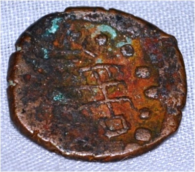 Coin in irregular shape. Obverse Deer on the left facing female figure and brahmi legend at the bottom. Reverse Tree in railing showing three horizontal branches, each with short vertical leaves pointing downwards a wavy line in left and nandi pada on the top.
