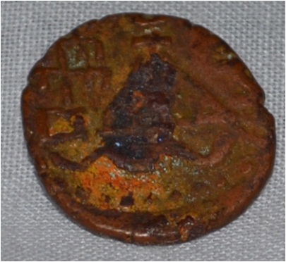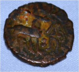 Coin in irregular shape. Obverse Deer on the left facing female figure at the bottom and brahmi legend on the top. Reverse Tree in railing showing two horizontal branches in right and arched hill with umbrella at the centre.