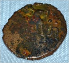 Coin in irregular shape. Obverse Deer on the left facing female figure with up raised right hand and left on the hip on the top. Reverse Triangle headed with a base in right and swastika above and arched hill with umbrella at the centre.