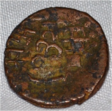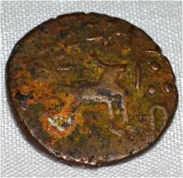 Coin in irregular shape. Obverse Deer on the left facing female figure with up raised right hand and brahmi legend on the top Reverse Triangle headed with a base in right and swastika above, six arched hill with umbrella at the centre and tree in railing showing two horizontal branches in left.