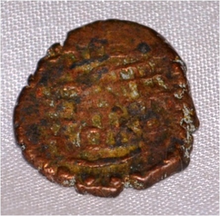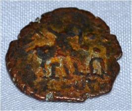 Coin in irregular shape. Obverse Deer on the left facing female figure with up raised right hand and left hand on the hip. Brahmi legend at the bottom. Reverse Triangle headed with a base in right and swastika above, six arched hill with umbrella at the centre and tree in railing showing three horizontal branches in left.