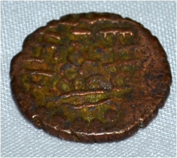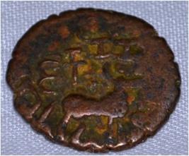 Coin in irregular shape. Obverse Deer at the bottom and brahmi legend above it. Reverse Triangle headed with a base in right and swastika above, six arched hill with umbrella at the centre, tree in railing showing three horizontal branches in left and nandi pada on the top.