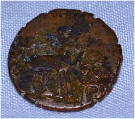 Coin in irregular shape. Obverse Deer on the left facing female figure with up raised right hand and brahmi legend on the right. Reverse Tree in railing showing three horizontal branches in right, Six arched hill with umbrella at the centre, triangle headed with a base on the left and nandi pada on the top.
