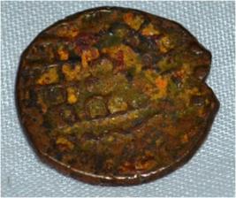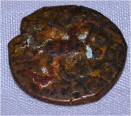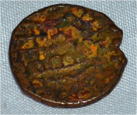 Coin in irregular shape. Obverse Deer on the left facing female figure with up raised right hand and left hand on hip. Brahmi legend on the top and bottom. Reverse Tree in railing showing three horizontal branches in right, six arched hill with umbrella at the centre, triangle headed with a base on the left and swastika above.