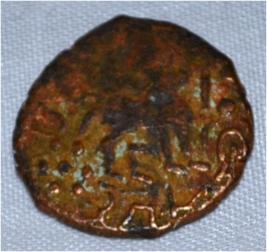 Coin in irregular shape. Obverse Deer on the left facing female figure with up raised hand and brahmi legend above it. Reverse Triangle headed with a base in right, six arched hill with umbrella at the centre, tree in railing showing three horizontal branches in left and nandi pada on the top. Dotted border around it.