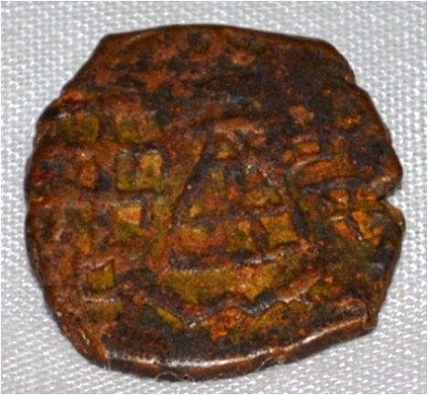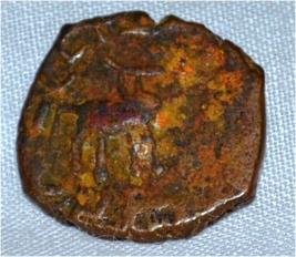 Coin in irregular shape. Obverse Deer at the centre and brahmi legend above it. Reverse Tree in railing showing three horizontal branches in right, six arched hill with umbrella at the centre,Triangle headed with a base and swastika above it.