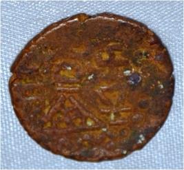Coin in irregular shape. Obverse Deer at the bottom and brahmi legend above it. Reverse Tree in railing showing three horizontal branches in right, six arched hill with umbrella at the centre, Triangle headed with a base on the left and swastika above it.