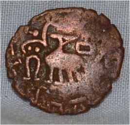 Coin in irregular shape. Obverse Female figure on the right with up raised left hand and right on his hip, deer on the centre and facing and brahmi legend around. Reverse Tree in railing showing horizontal branches in right, six arched hill at the centre, triangle headed with a base on the left and swastika above it. Nandi pada on the top.