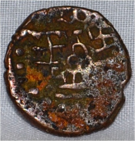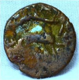Coin in irregular shape. Obverse Deer at the centre facing left and brahmi legend in semi-circle. Reverse Tree in railing showing three horizontal branches in right, six arched hill with umbrella at the centre, swastika on the top left and nandi pada on the top.