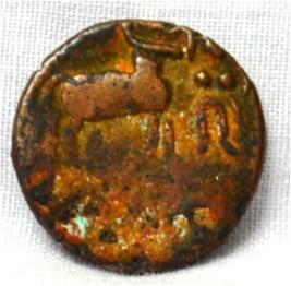 Coin in irregular shape. Obverse Deer on the top and facing female figure with up raised hand and traces of the legend at the bottom. Reverse Swastika symbol on the top right, arched hill at the centre, tree in railing in left and nandi pada on the top.
