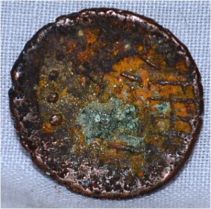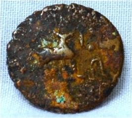 Coin in irregular shape. Obverse Deer at the centre facing female figure on the left. Reverse Swastika on top right, arched hill at the center and tree in railing showing four horizontal branches in left.