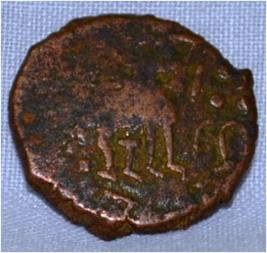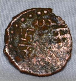 Coin in irregular shape. Obverse Deer at the centre facing female figure with up raised right hand and traces of legend at the bottom. Reverse Triangle headed with a base on the right and swastika above it. Tree in railing showing horizontal branches each with short vertical leaves in left and nandi pada on the top.