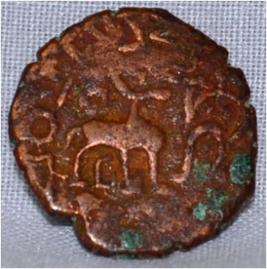 Coin in irregular shape. Obverse Deer on the left facing female figure with up raised right hand and left on hip. Traces of legend in semi- circle on the right side. Reverse Tree in railing showing horizontal branches each with short vertical leaves in left and arched hill with umbrella at the top.