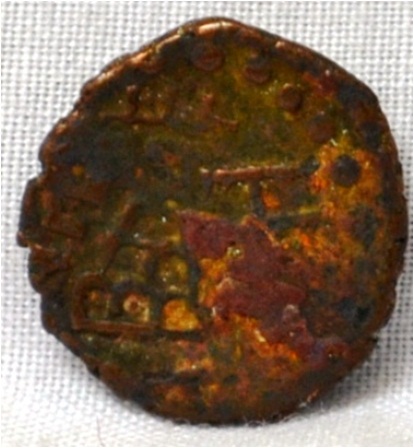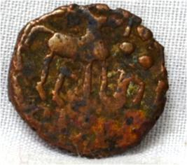 Coin in irregular shape. Obverse Deer on the left facing female figure and traces of legend at the bottom. Reverse Swastika on the right and nandi pada above it, six arched hill at the centre , tree in railing in left.