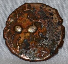 Coin in irregular shape. Obverse Deer at the centre facing left and traces of legend above it. Reverse Triangle headed with a base on the right and swastika above it, six arched hill with umbrella at the centre, tree in railing in left and nandi pada on the top.