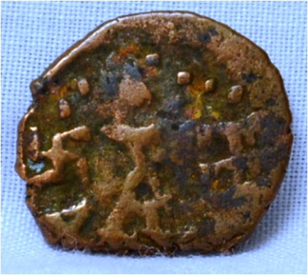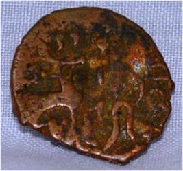 Coin in irregular shape. Obverse Deer on the left facing female figure with upraised right hand and left hand on hip. Traces of legend in semi-circle. Reverse Triangle headed on the right and swastika above it, arched hill with umbrella at the centre and tree in railing in left.
