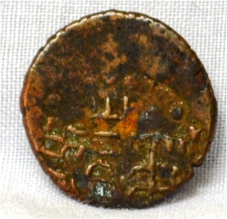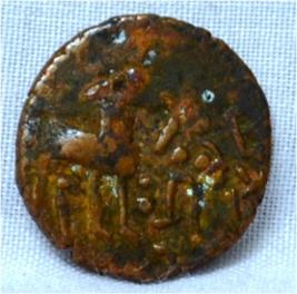 Coin in irregular shape. Obverse Deer on the right and facing female figure on the left with upraised right hand and traces of legend on the left Reverse Triangle headed on the right and swastika above it, arched hill with umbrella at the centre and nandi pada above it , tree in railing in left.