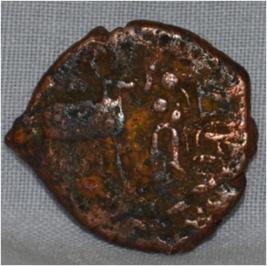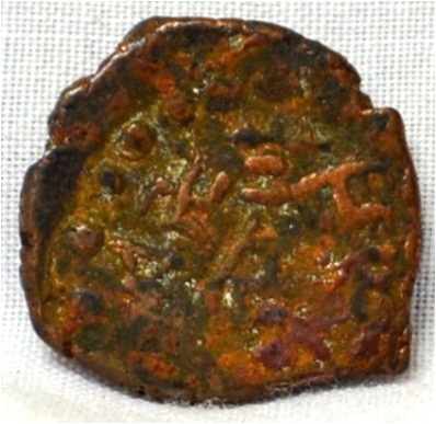 Coin in irregular shape. Obverse Deer on the right and facing female figure with upraised right hand and traces of legend in left. Reverse Triangle headed with a base on the right and swastika above it, arched hill with umbrella at the centre , tree in railing in left.