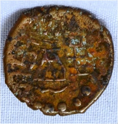 Coin in irregular shape. Obverse Deer at the centre, facing female figure with upraised right hand and traces of legend above the deer. Reverse Triangle headed with a base on the right and swastika above, six arched hill with umbrella at the centre, tree in railing on the left and nandi pada on the top.