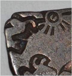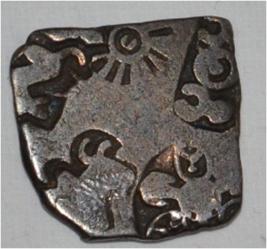 Obverse Five puches are shown. It is the imperial series where Sun appears on the top. Bull and flower at the bottom. Two unidentified symbols are shown on the top left and right side. Reverse Three indistinct symbols at the centre.