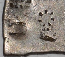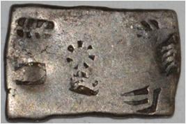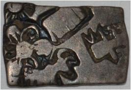 Obverse Five symbols are shown. Sun, flower and bull are on right. Two unidentified figures on the left. Reverse Flower at the centre and three indistinct figures on the either sides.