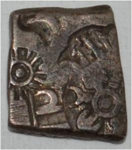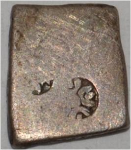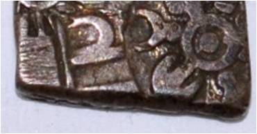 Obverse Five symbols are shown. Sun on right, flower on left and trunk on the middle. Two unidentified symbols on the top. Reverse Two indistinct marks.