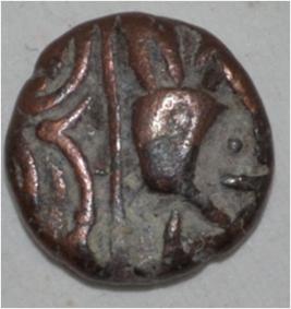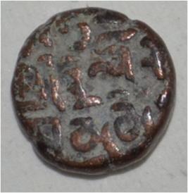 Obverse Horseman to the left. Man on the horseback and flagpole at the back of horse. Reverse Traces of Sri Trilok Chandra .