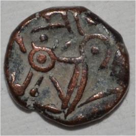 Obverse Horseman to the left. Man on the horseback and flagpole at the back of horse. Reverse Couchant bull facing right and Traces of legend on the top.
