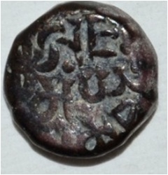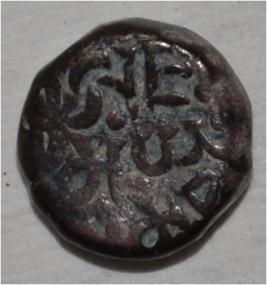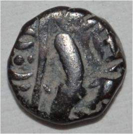 Obverse Horseman to the left. Man on the horseback and flagpole at the back of horse. Reverse Traces of Maharaja Megha Chandra .