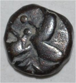 Obverse Horseman to the left. Man on the horseback. Reverse Traces of Maharaja Sri Megha .