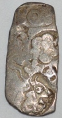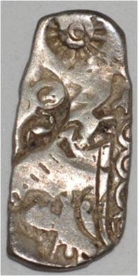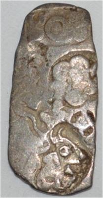 Obverse One side of the coin is in longer and the other side is in small and curving. Sun on the top. Zig-zag on left edge. Reverse Tree and bull at the lower left side.other marks are not very significant.