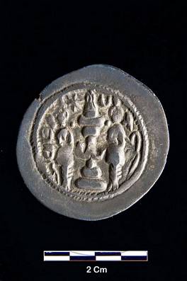 | Description / विवरण | Obverse Bust of a king to right inside a circle. Probably Khusru II Parviz , a star on left and star inside a crescent on the right near the crown. There are three crescents on the margins touching the circle. Reverse Narrow fire altar with rounded out line, crescent right star left above attendants facing front, a crescent over each. Legend illegible. |