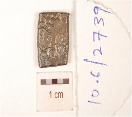 | Description / विवरण | A silver punch mark coin, rectangular in shape having image of sun and plant motif on obverse side and tarnished surface. |
