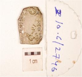 | Description / विवरण | A punch mark silver coin, rectangular in shape, having sun, loop and floral pattern on obverse side and slightly tarnished. |