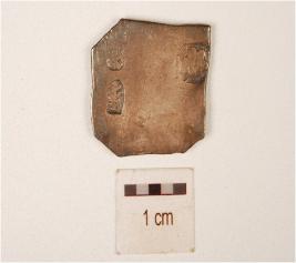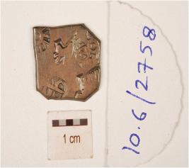 | Description / विवरण | A punch mark silver coin rectangular in shape, having sun, bull, deer on hill, loops and floral motifs on obverse side and plant motif on reverse side, cutting edge and slightly tarnished. |