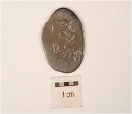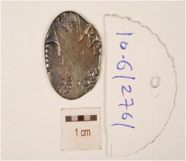 | Description / विवरण | A punch mark silver coin irregularly round in shape, having bull, sun, deer on hill, brahmi ma and floral pattern on obverse side and plat pattern on reverse side, slightly tarnished. |