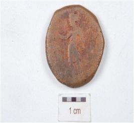| Description / विवरण | A copper coin, round in shape, image of standing diety with left hand on akimbo and right hand raised depicted on obverse side, and diety riding elephant depicted on reverse side, made by cast technique, chemically treated and preserved |