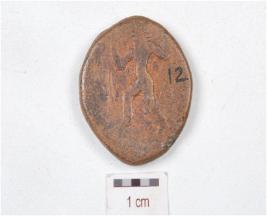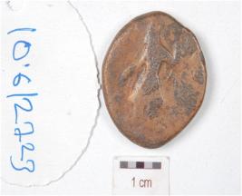 | Description / विवरण | A copper coin, round in shape, image of standing made with both raised hand is depicted on obverse side and standing diety with left hand raised on reverse side, made with cast technique and chemically treated and preserved. |