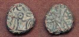 | Description / विवरण | Descrpn./Obv Recumbent bull facing left, wearing jhula (saddle cloth). Above, legend in Sarada script Sri Samantadeva (in cursive letters, mostly truncated and seen partially or off the flan). Descrpn./Rev Rider with lance on caparisoned horse facing right. |