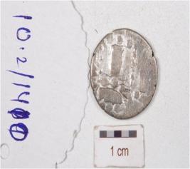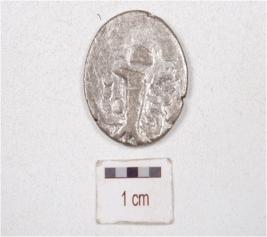 | Description / विवरण | A silver coin, round in shape, surface is smooth and having tree motif one side surface, unidentified image on other side and tarnished surface. |