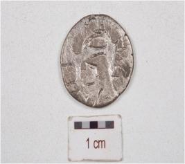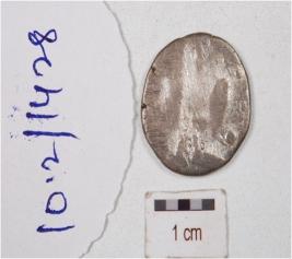 | Description / विवरण | A silver coin, surface is smooth and round in shape, having unidentifed image on one side and another side surface is defaced. |