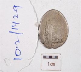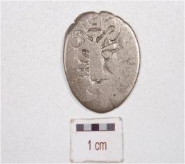 | Description / विवरण | A silver coin, round in shape, having tree motif on one side surface and another side is defaced and tarnished surface. |