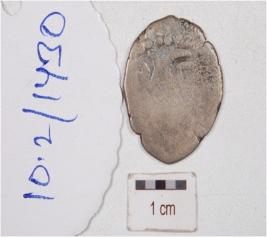 | Description / विवरण | A silver coin, irregular roundish surface, having unidentified image on both side surface and tarnished surface. |