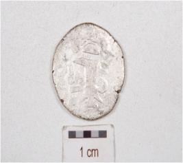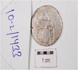 | Description / विवरण | A silver coin, round in shape, having tree image on one side surface, and another side having unidentified modif tarnished. |